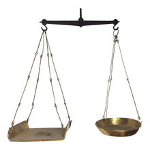 Brass hanging balance scale with Iron beam support. The scale is hung with a large hook.